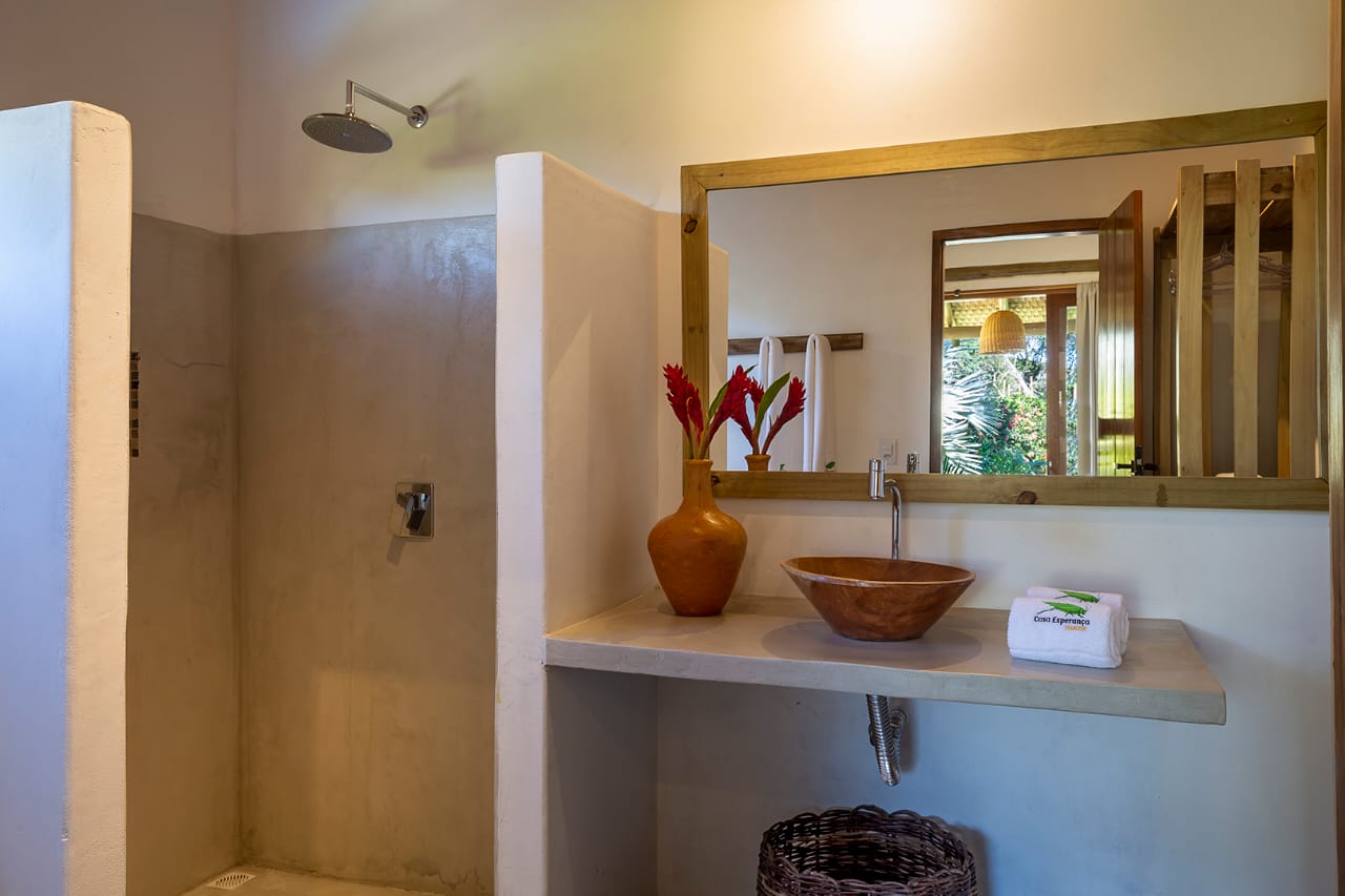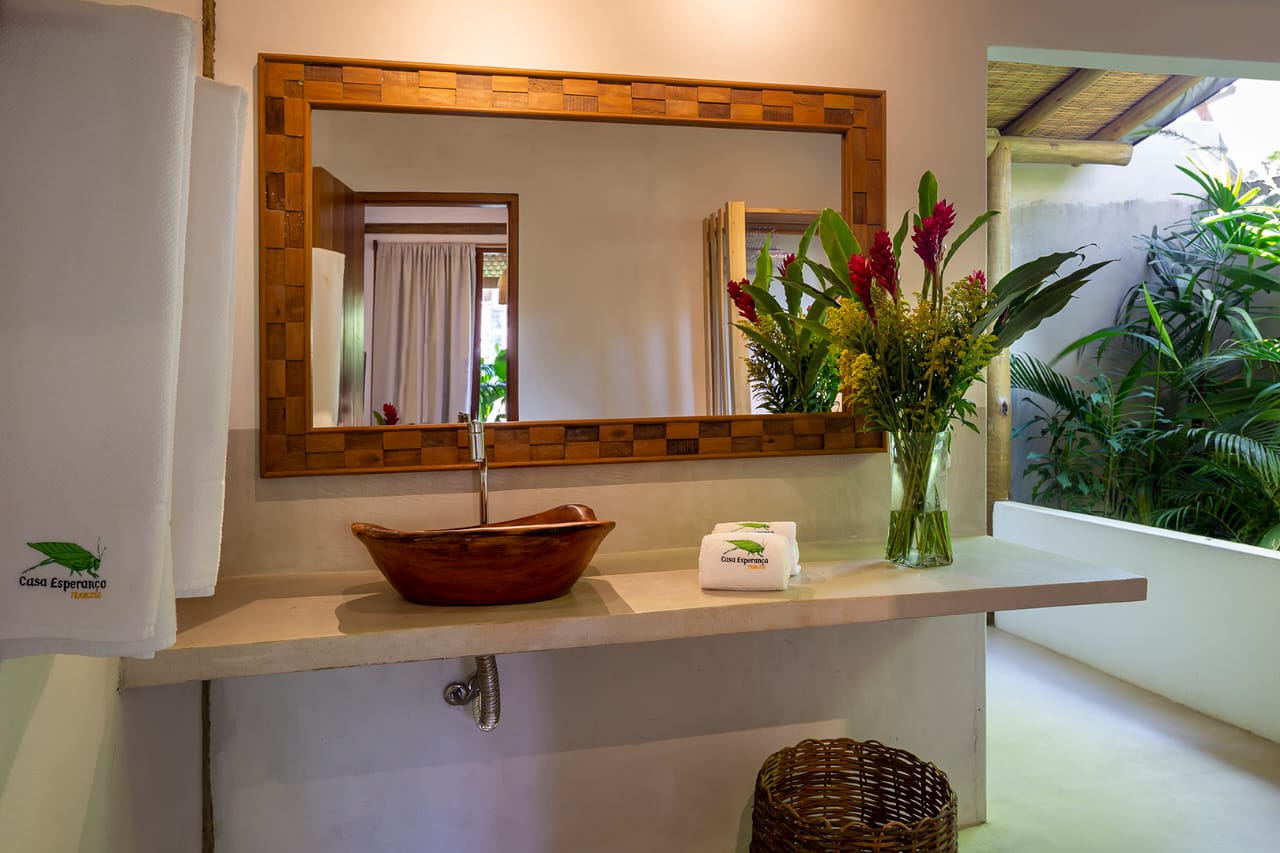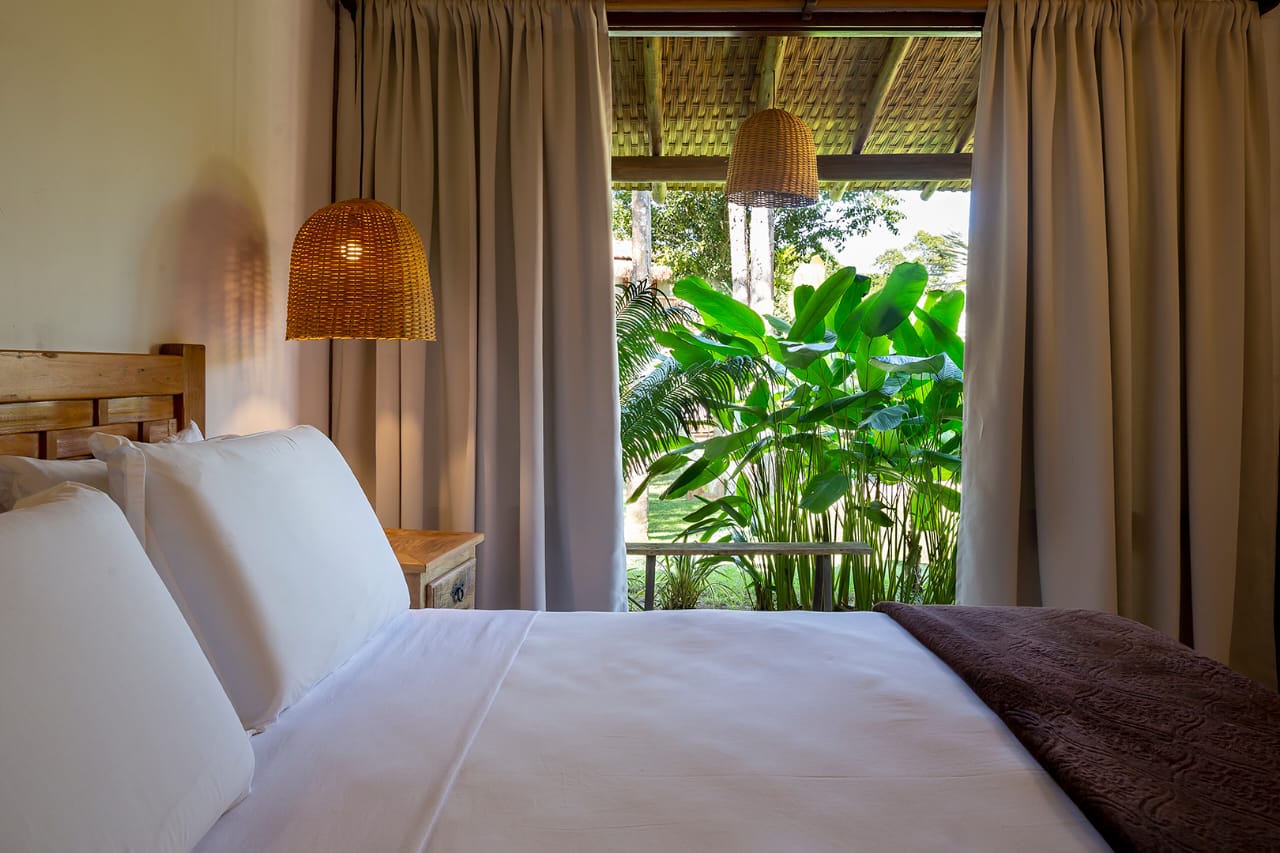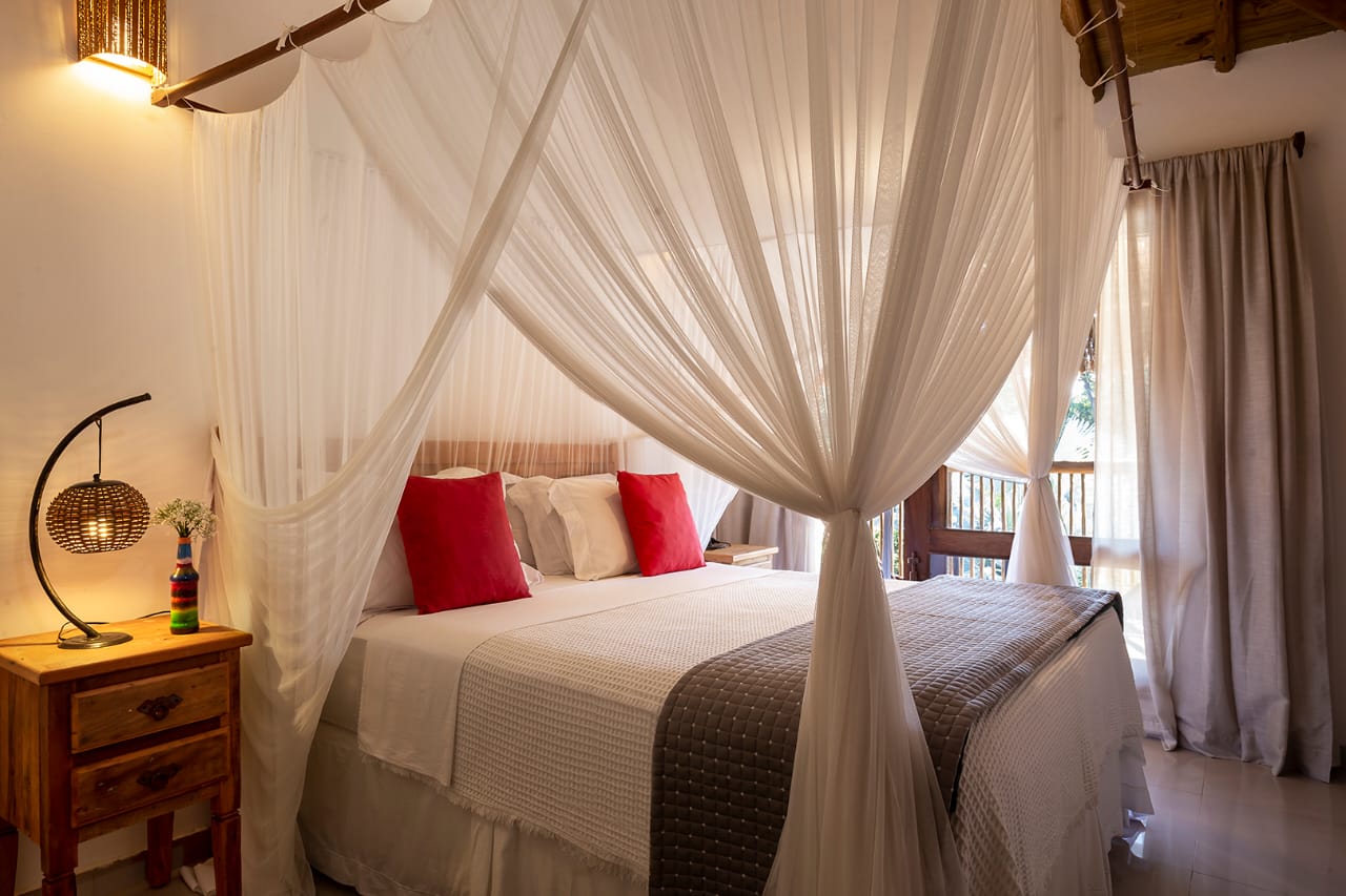- Quarto 6: Cama Queen com mosquiteiro e criado-mudo (parte superior, banheiro ao lado)