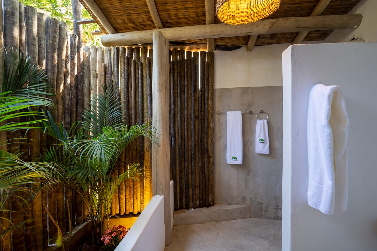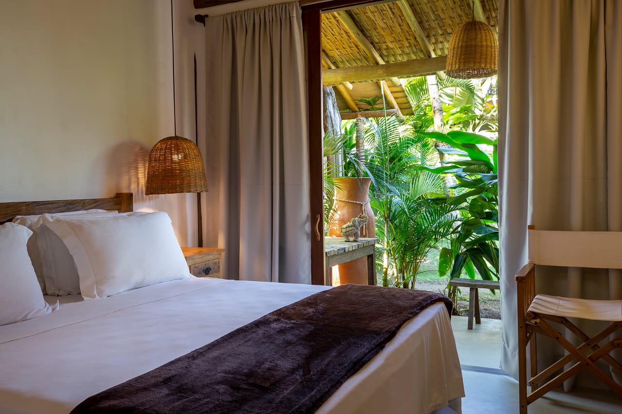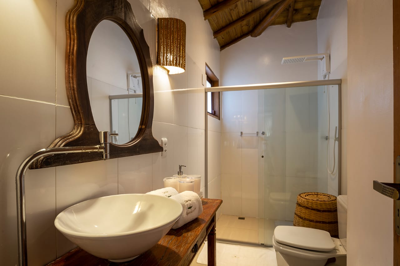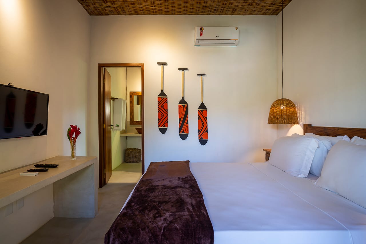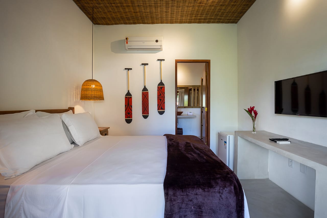 - Quarto 7: Cama Queen com mosquiteiro e criado-mudo (parte superior, banheiro ao lado)