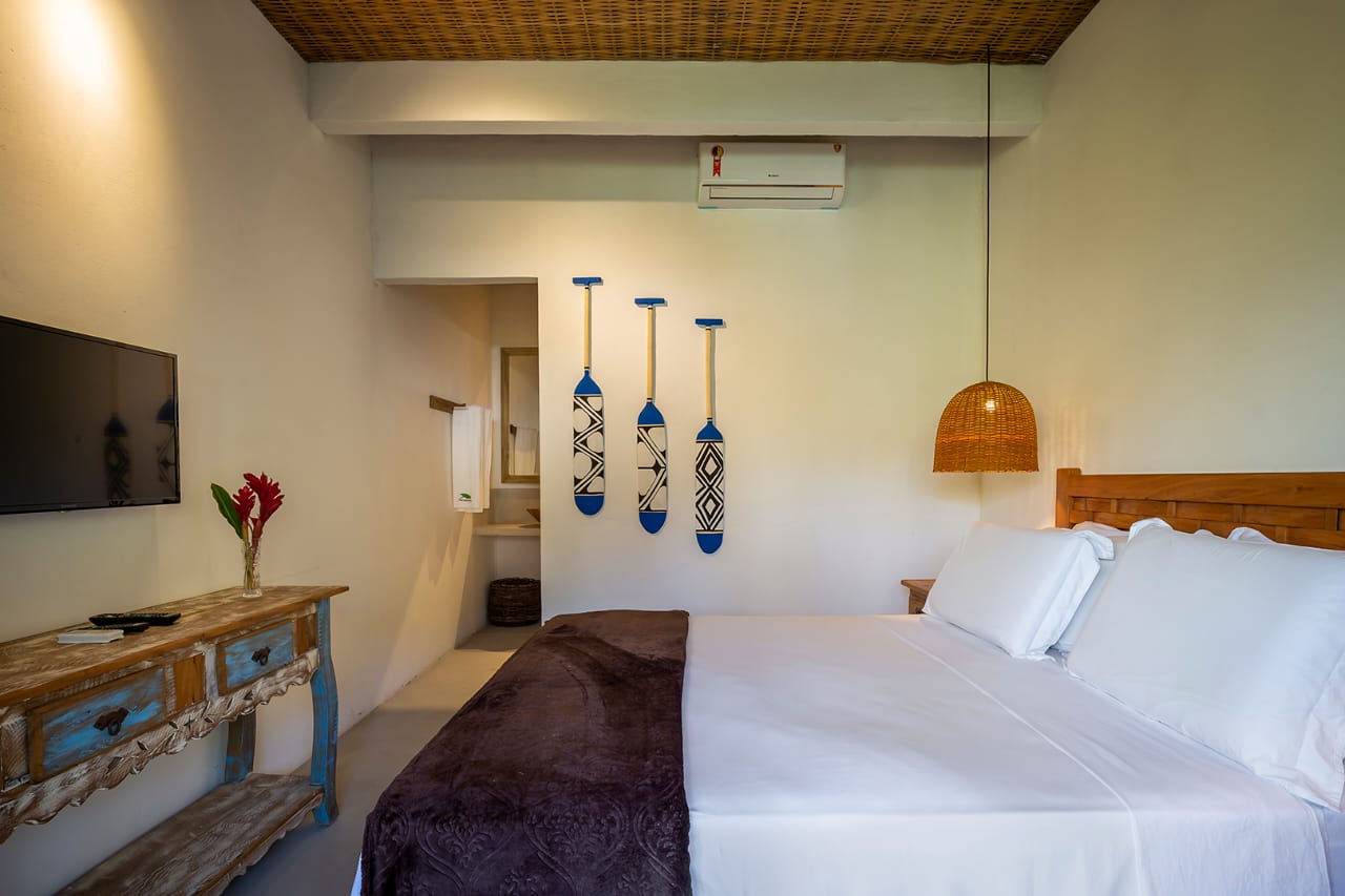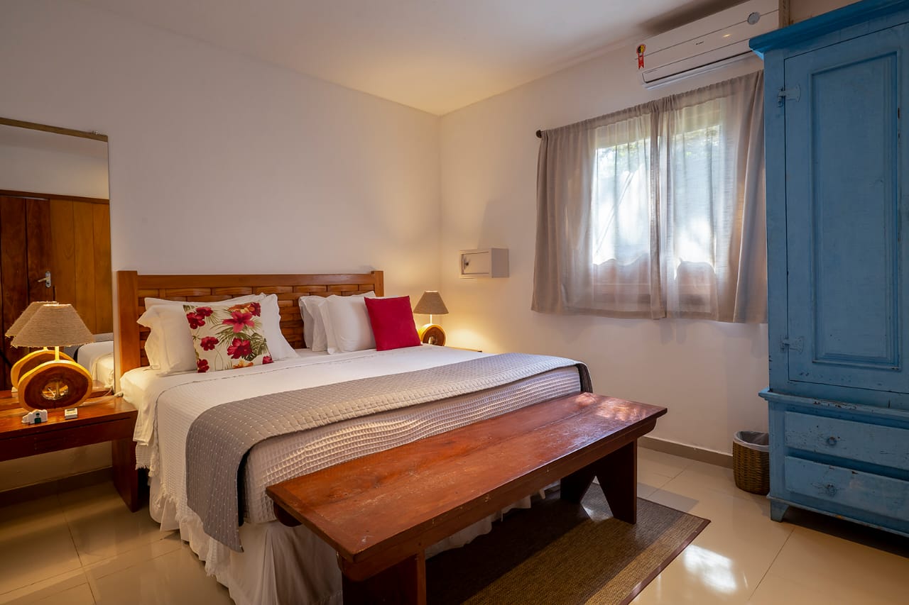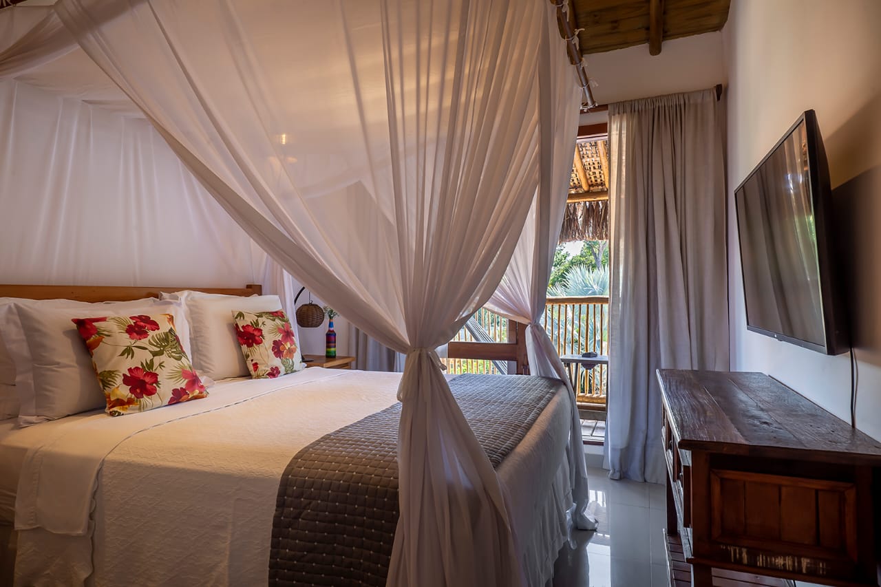 - Suíte 5: Cama Queen com mosquiteiro, criado-mudo e TV (parte anexa da casa)
