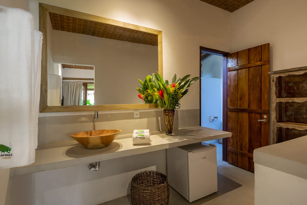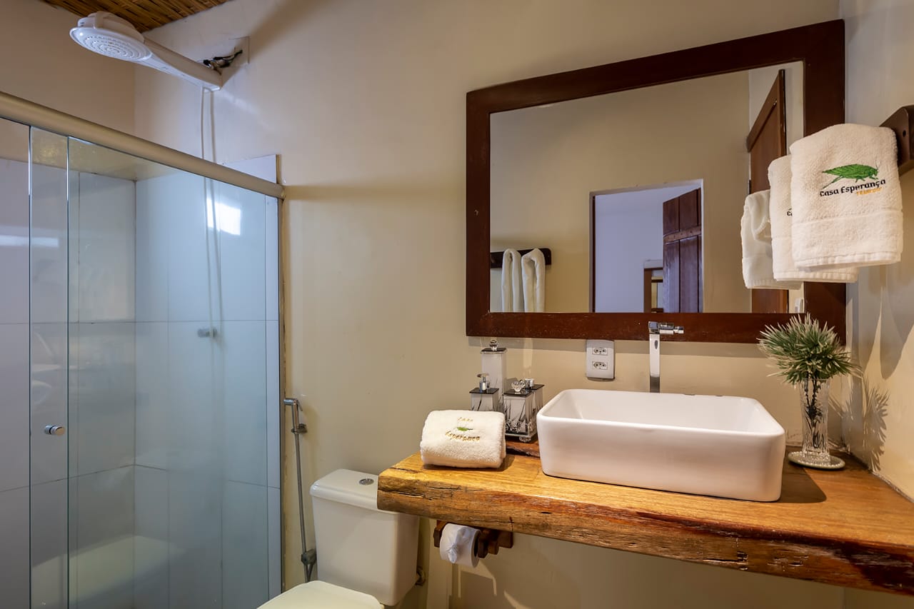 - Suíte 4: Cama Queen com mosquiteiro, criado-mudo e TV (parte anexa da casa)