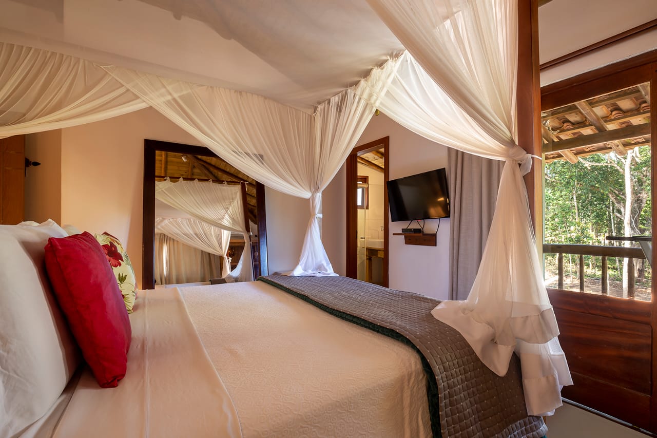 - Suíte 1: Cama Queen com dossel, TV, armário, criado-mudo e varanda individual (parte superior)